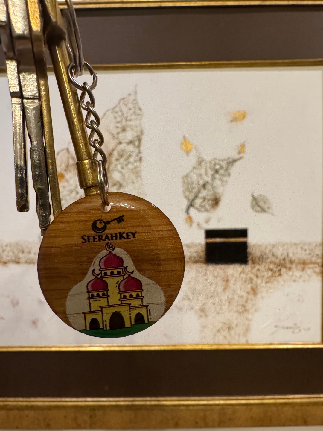SeerahKey wooden keychain with mosque illustration